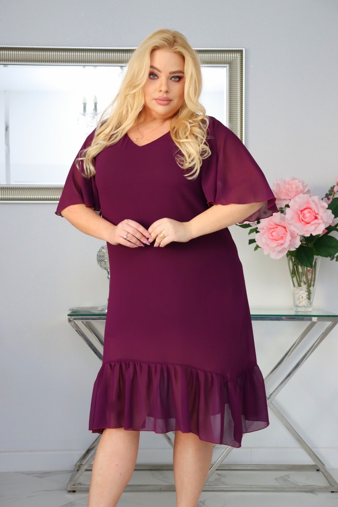 Sukienka Tamira z falbanką z żorżety szyfonowa BURGUND