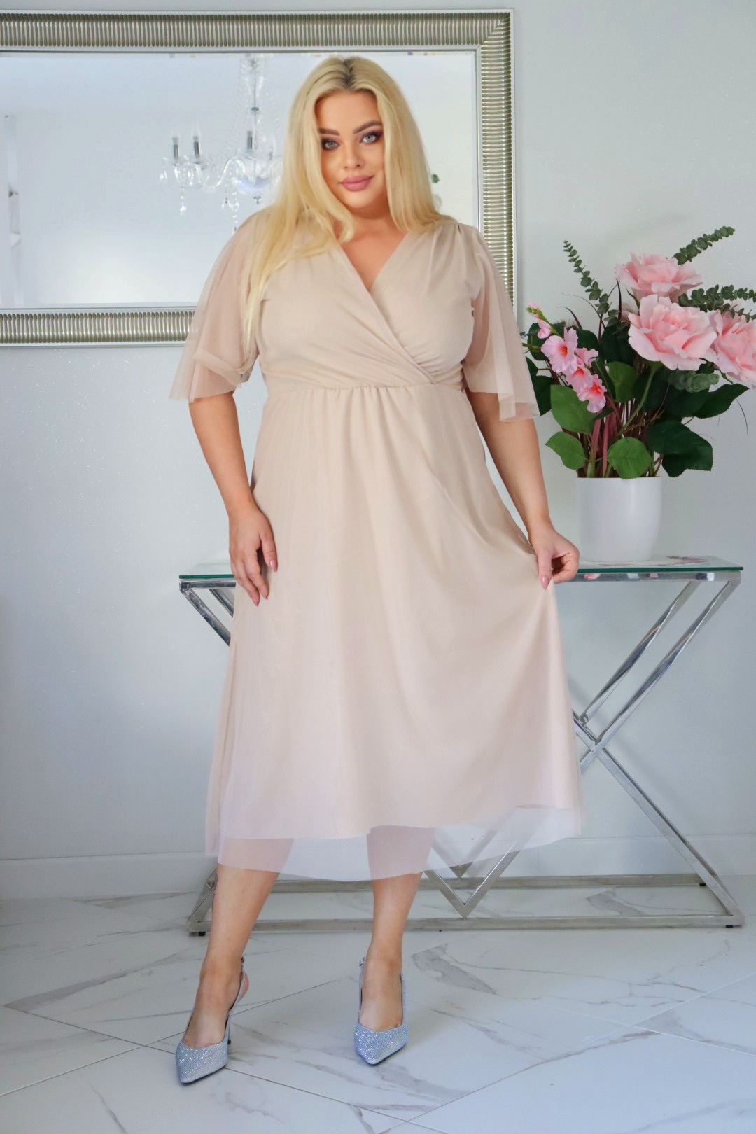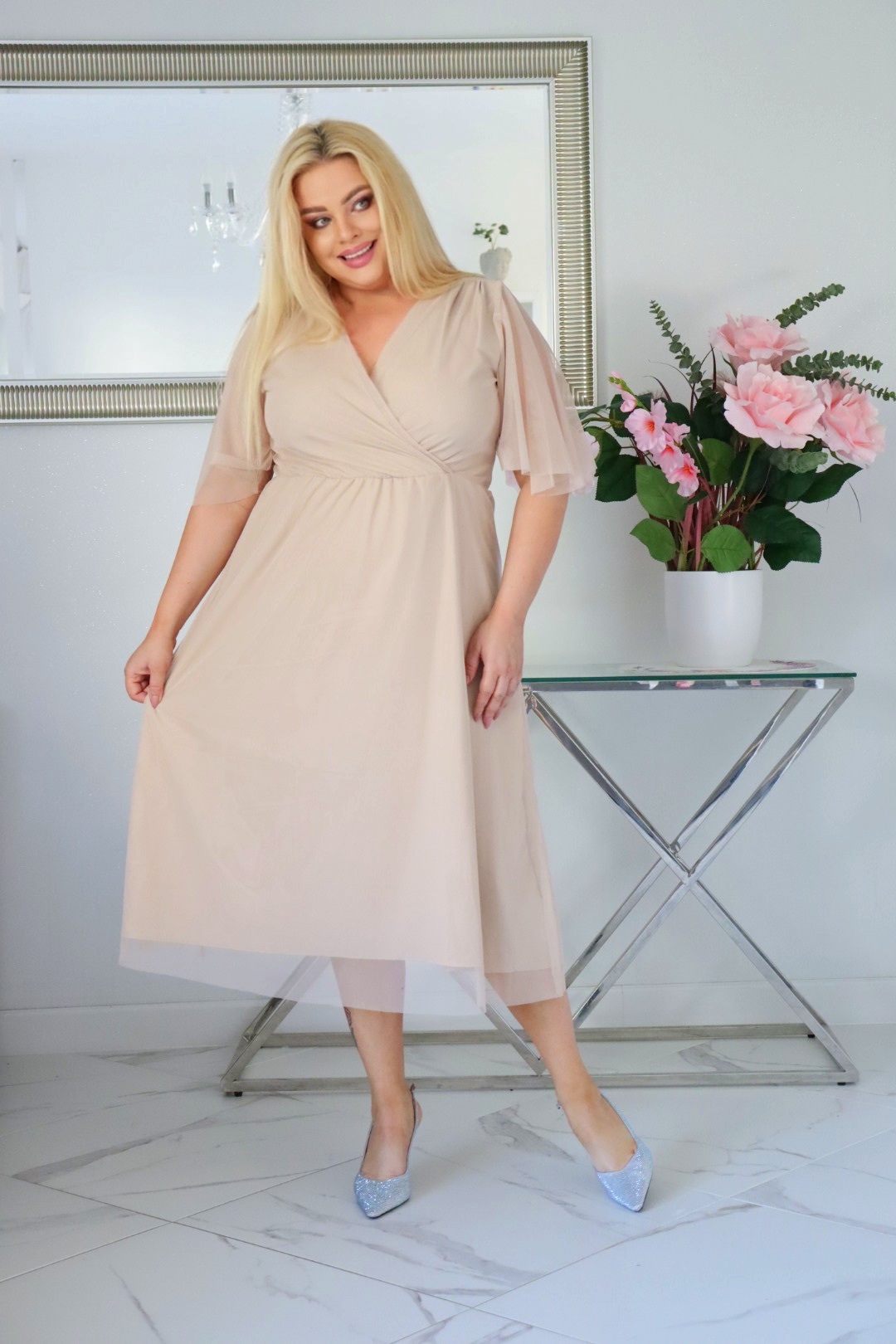 ⭐⭐⭐⭐⭐ 5.0Bestseller161+ sprzedanych!🇵🇱 Polski ProduktElegancja spotyka komfort – sukienka Lidia z elastyczną talią i tiulowym wykończeniem nude