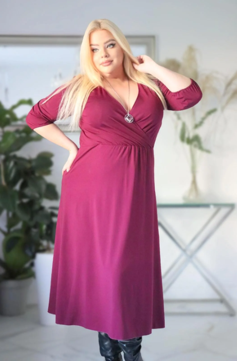 - Kopertowy, elegancki dekolt to absolutny hit – jest nie tylko modny, ale także pięknie wydłuża szyję i eksponuje biust, sprawiając, że cała sylwetka wygląda na smuklejszą.