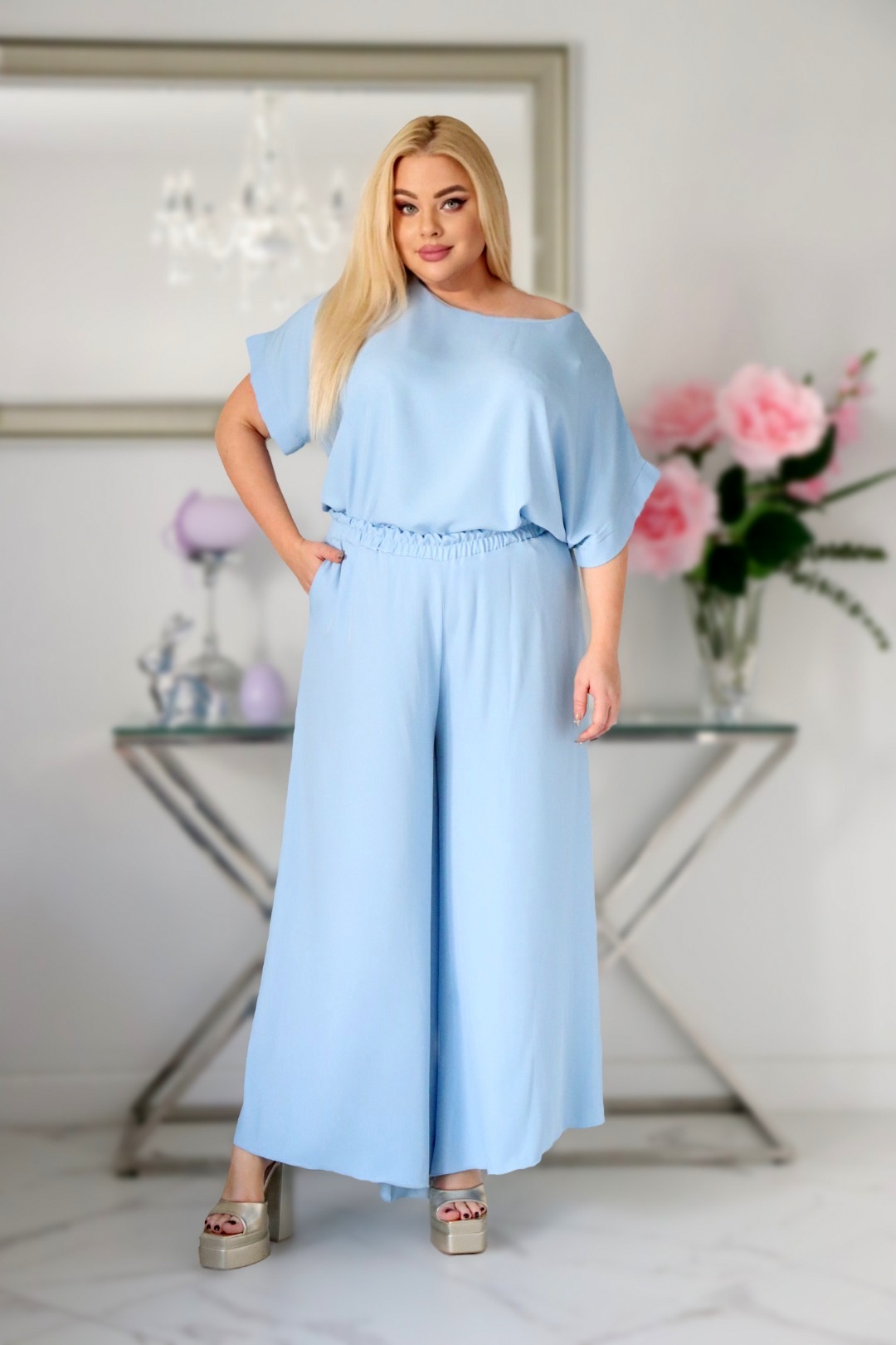 Propozycja dla kobiet, które cenią połączenie komfortu i klasy. Zestaw składający się z luźnej bluzki oraz zwiewnych spodni to idealny wybór na ciepłe dni, eleganckie spotkania i codzienne stylizacje z nutą romantyzmu.