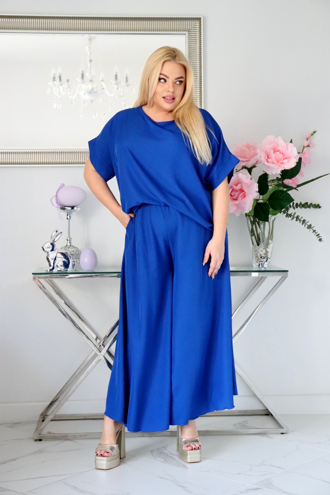 • Szerokie, zwiewne nogawki, które optycznie wydłużają sylwetkę.
