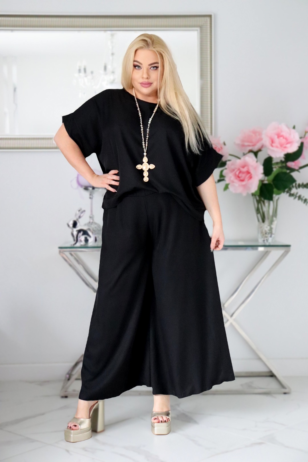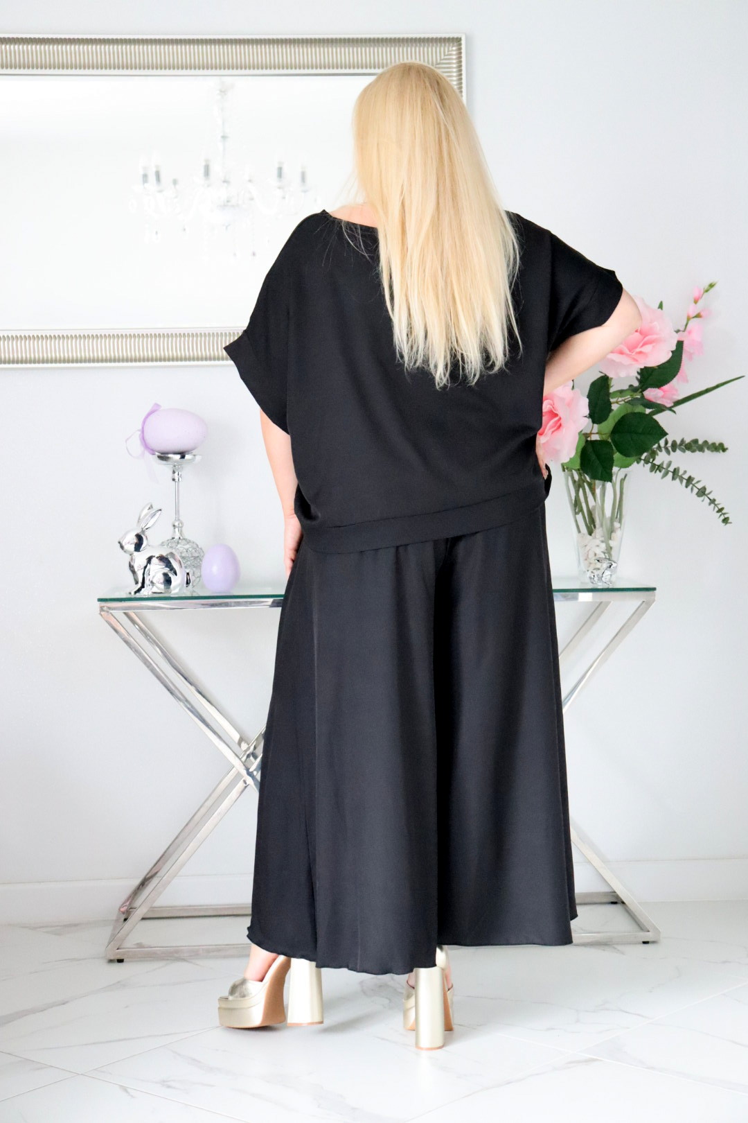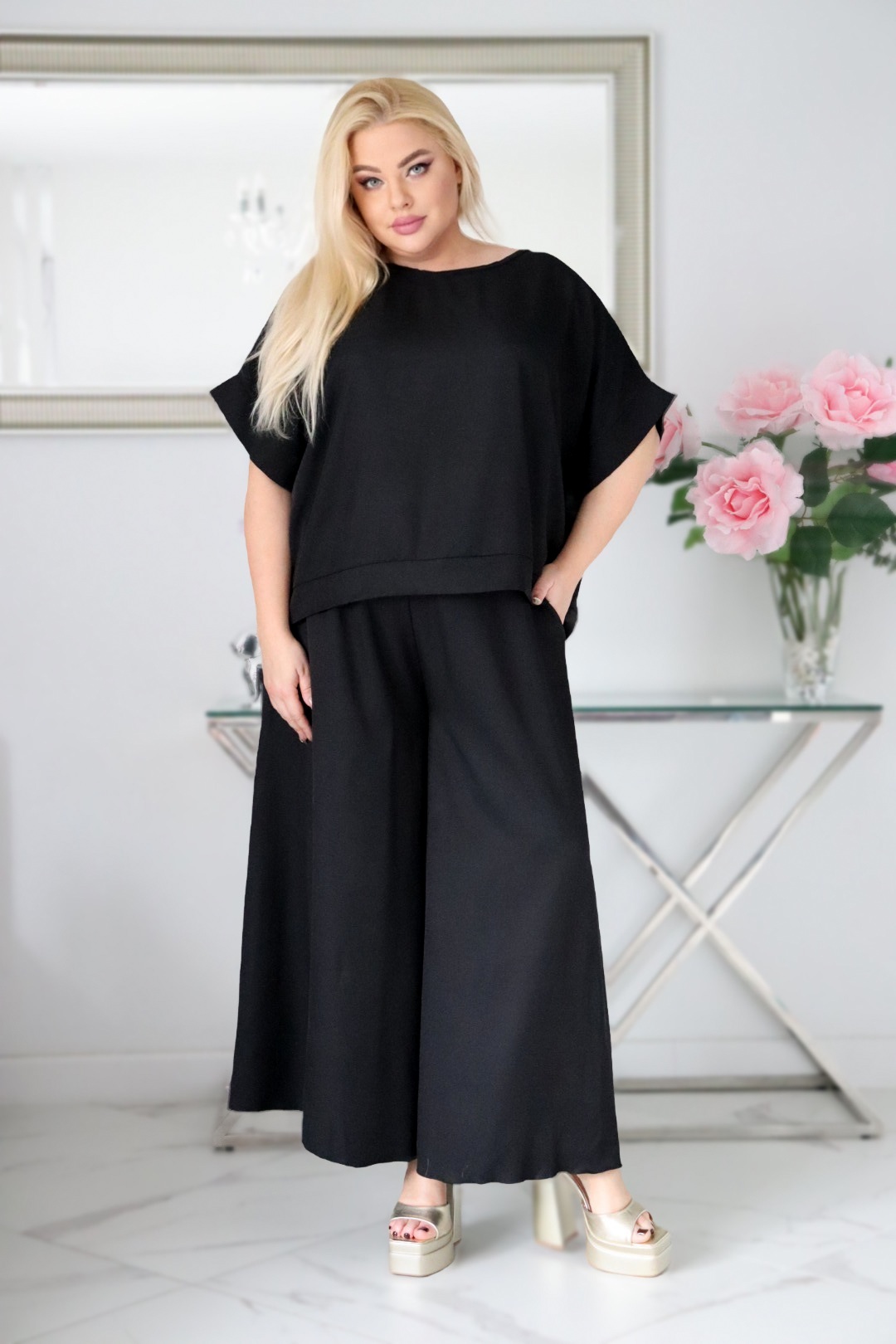 • Szerokie, zwiewne nogawki, które optycznie wydłużają sylwetkę.