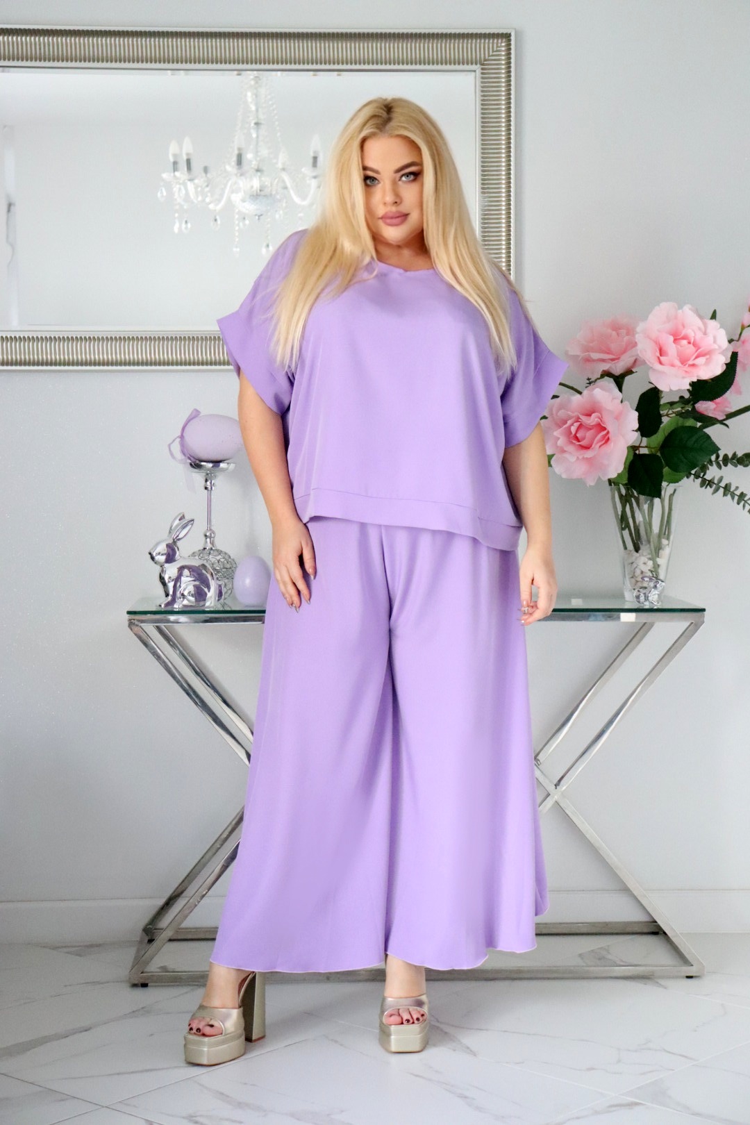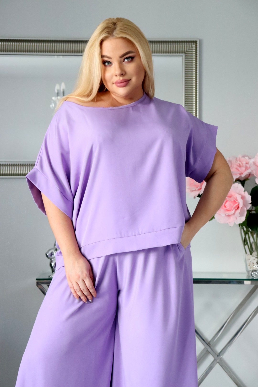 Propozycja dla kobiet, które cenią połączenie komfortu i klasy. Zestaw składający się z luźnej bluzki oraz zwiewnych spodni to idealny wybór na ciepłe dni, eleganckie spotkania i codzienne stylizacje z nutą romantyzmu.