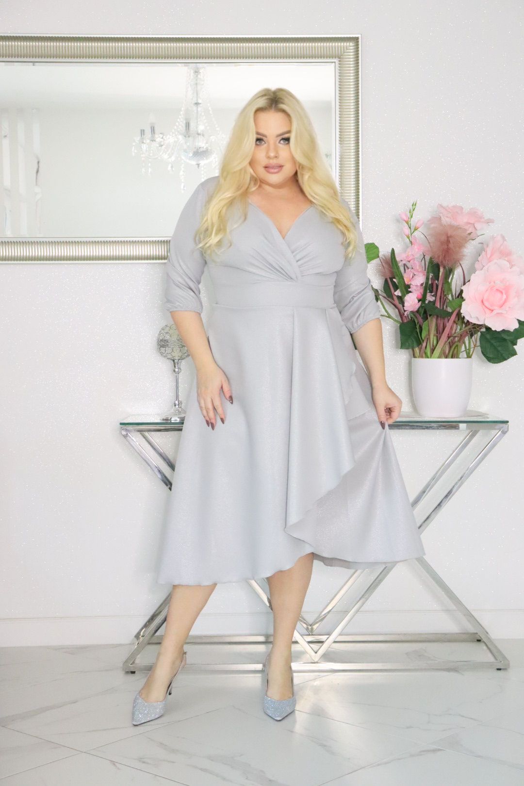 🇵🇱 Polski ProduktElegancka sukienka koktajlowa MARTINA – fason kopertowy, lekki połysk! SREBRNA!