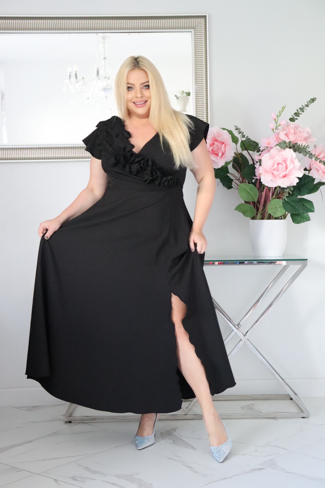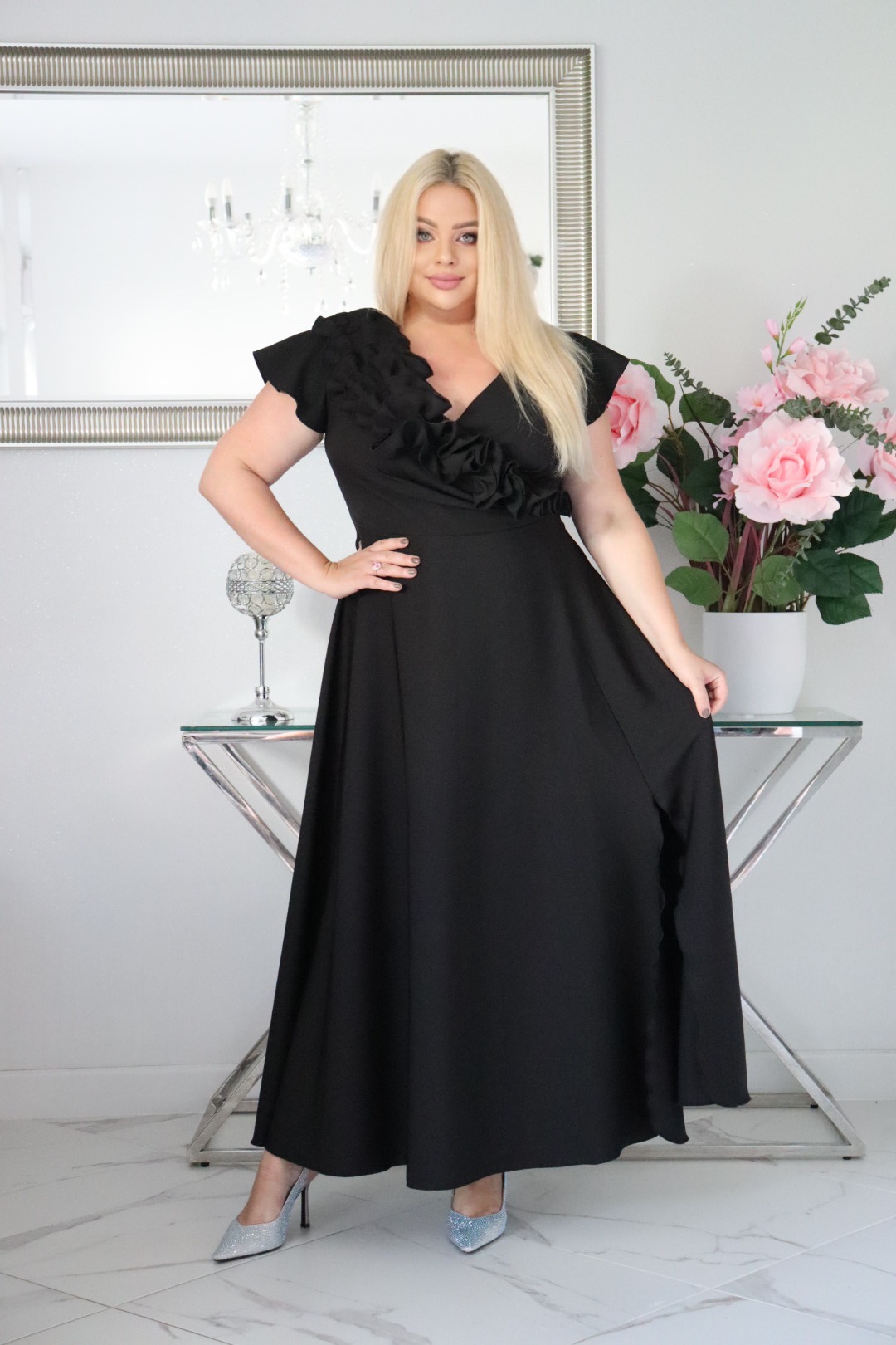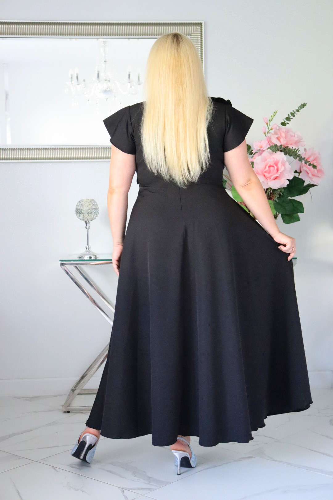 Bestseller72+ sprzedanych!🇵🇱 Polski ProduktOlśniewająca sukienka „Frezja” z kwiecistą falbaną i rozkloszowanym dołem gwarantuje spektakularny „efekt glamour”! CZARNA