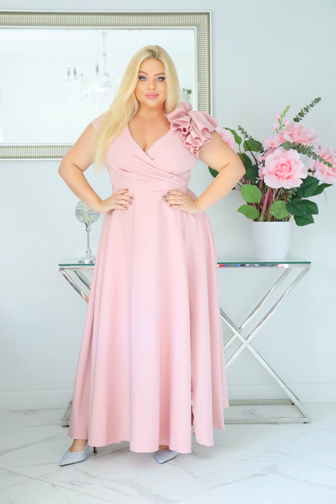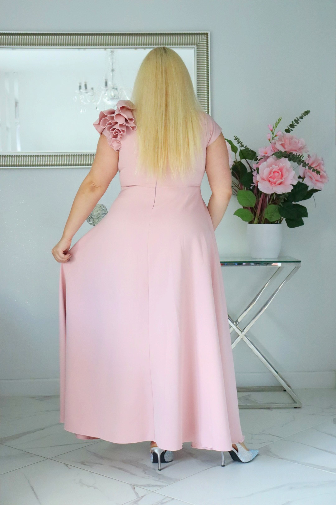 Bestseller117+ sprzedanych!🇵🇱 Polski ProduktOlśniewająca sukienka „Orchidea” z kwiecistą falbaną i rozkloszowanym dołem gwarantuje spektakularny „efekt glamour”! PUDROWY RÓŻ