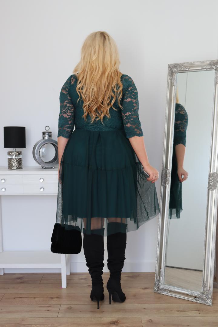 🇵🇱 Polski ProduktSukienka Adriana rozkloszowana z tiulu z kopertowym dekoltem i koronkową górą butelkowa zieleń