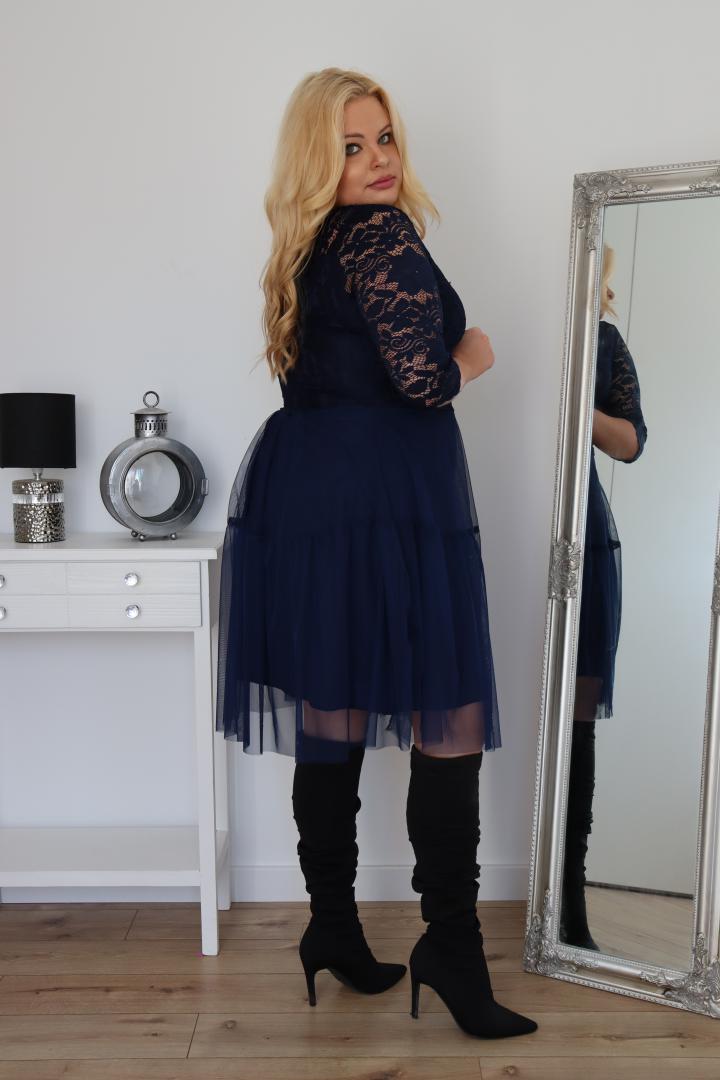 🇵🇱 Polski ProduktSukienka Adriana rozkloszowana z tiulu z kopertowym dekoltem i koronkową górą granat