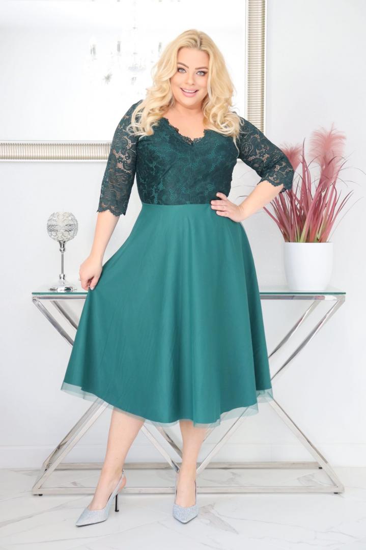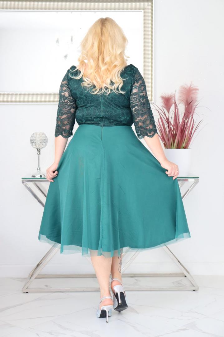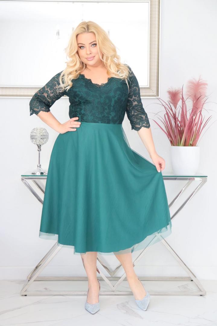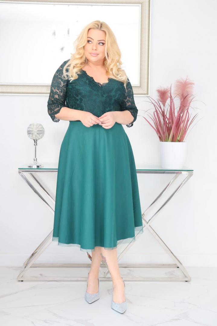 🇵🇱 Polski ProduktSukienka Ariana rozkloszowana elastyczna koronka koło z tiulu butelkowa zieleń