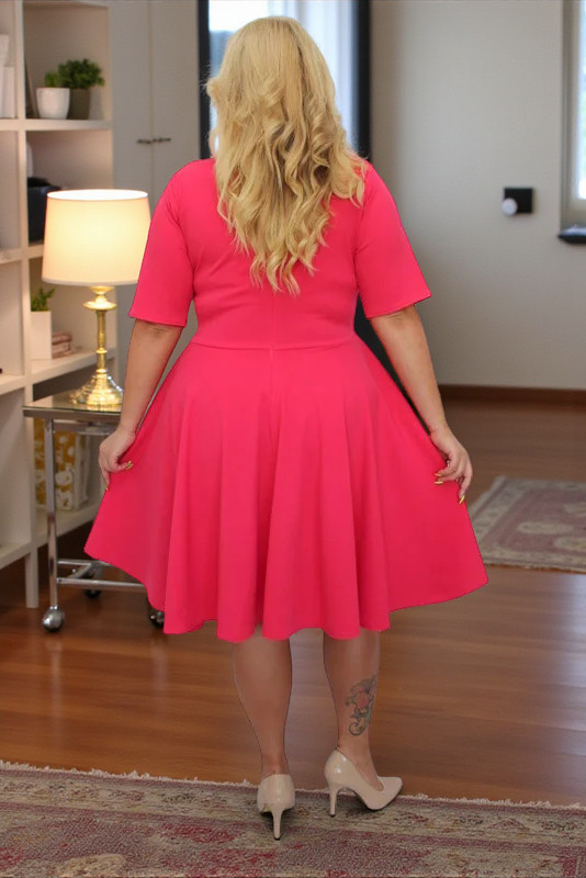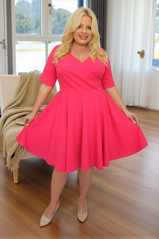 Sukienka jest wykonana z lekko elastycznego materiału. Rozkloszowany dół z koła, wbrew pozorom i obiekcjom, optycznie wyszczupla sylwtkę. Dekolt w kształcie litery V i odciętą, podkreśloną talią ładnie eksponuje kobiece kształty optycznie wydłużając i wysmuklając sylwetkę.