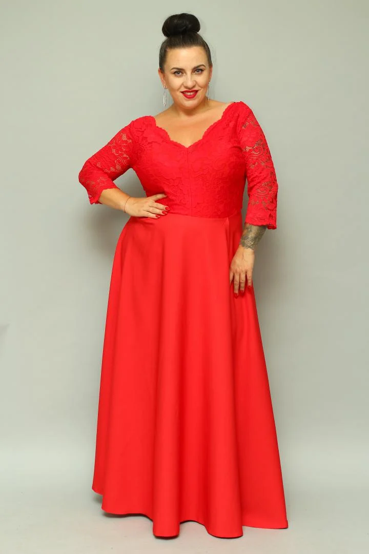 Sukienka Caterina maxi wieczorowa rozkloszowana ekskluzywna dekolt serek czerwona koronka kwiatki
