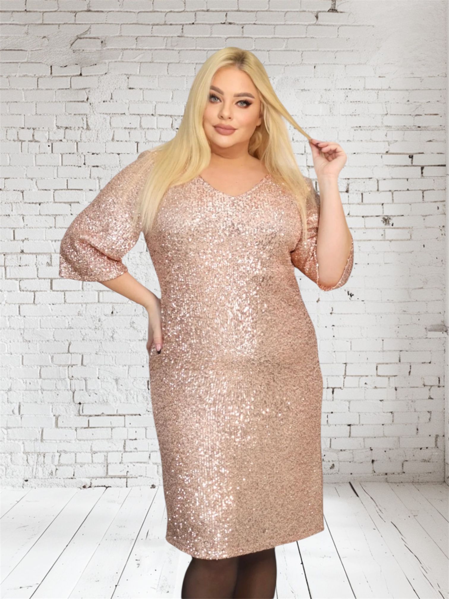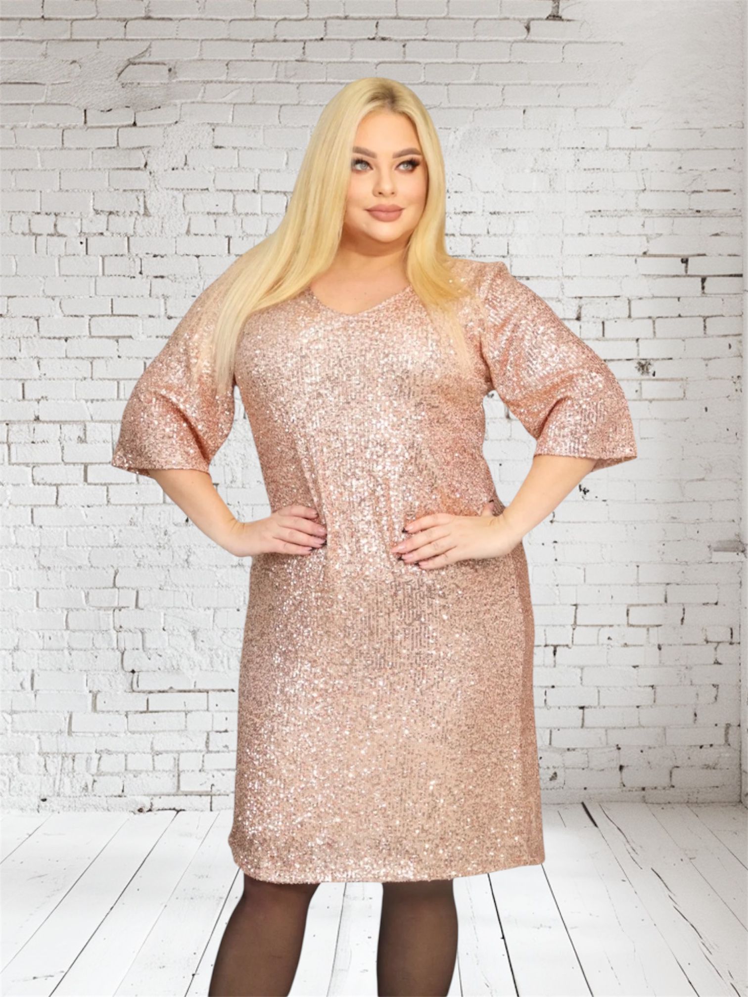 Sukienka jest wykonana z wysokiej jakości dzianiny cekinowej, która charakteryzuje się rozciągliwością około 4 cm.