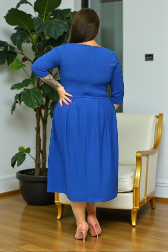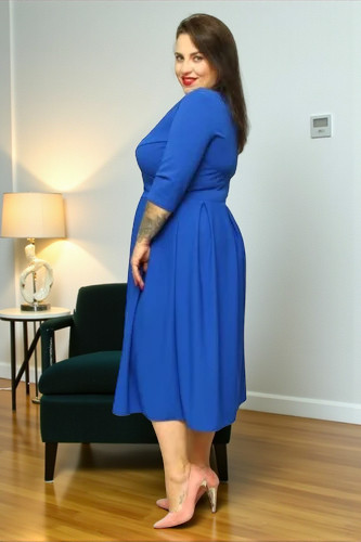 Sukienka jest wykonana z lekko elastycznego materiału. Rozkloszowany dół z kontrafałdami, wbrew pozorom i obiekcjom, optycznie wyszczupla sylwtkę. Dekolt w kształcie litery V i odciętą, podkreśloną talią ładnie eksponuje kobiece kształty optycznie wydłużając i wysmuklając sylwetkę.