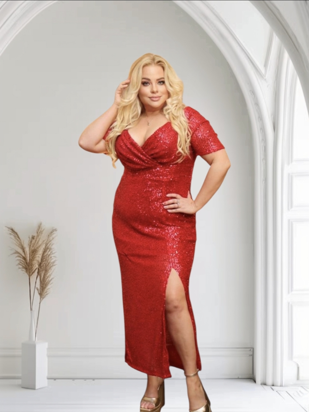 Sukienka Golden maxi ołówkowa cekinowa kopertowy dekolt CEKINY czerwona