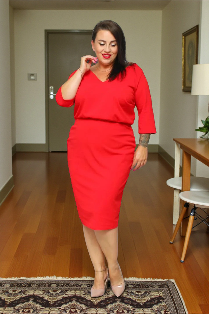 Sukienka jest wykonana z wysokiej jakości dzianiny, która charakteryzuje się rozciągliwością około 4 cm. Materiał nie mechaci się i nie kulkuje bo stawiamy zawsze i tylko na jakość.