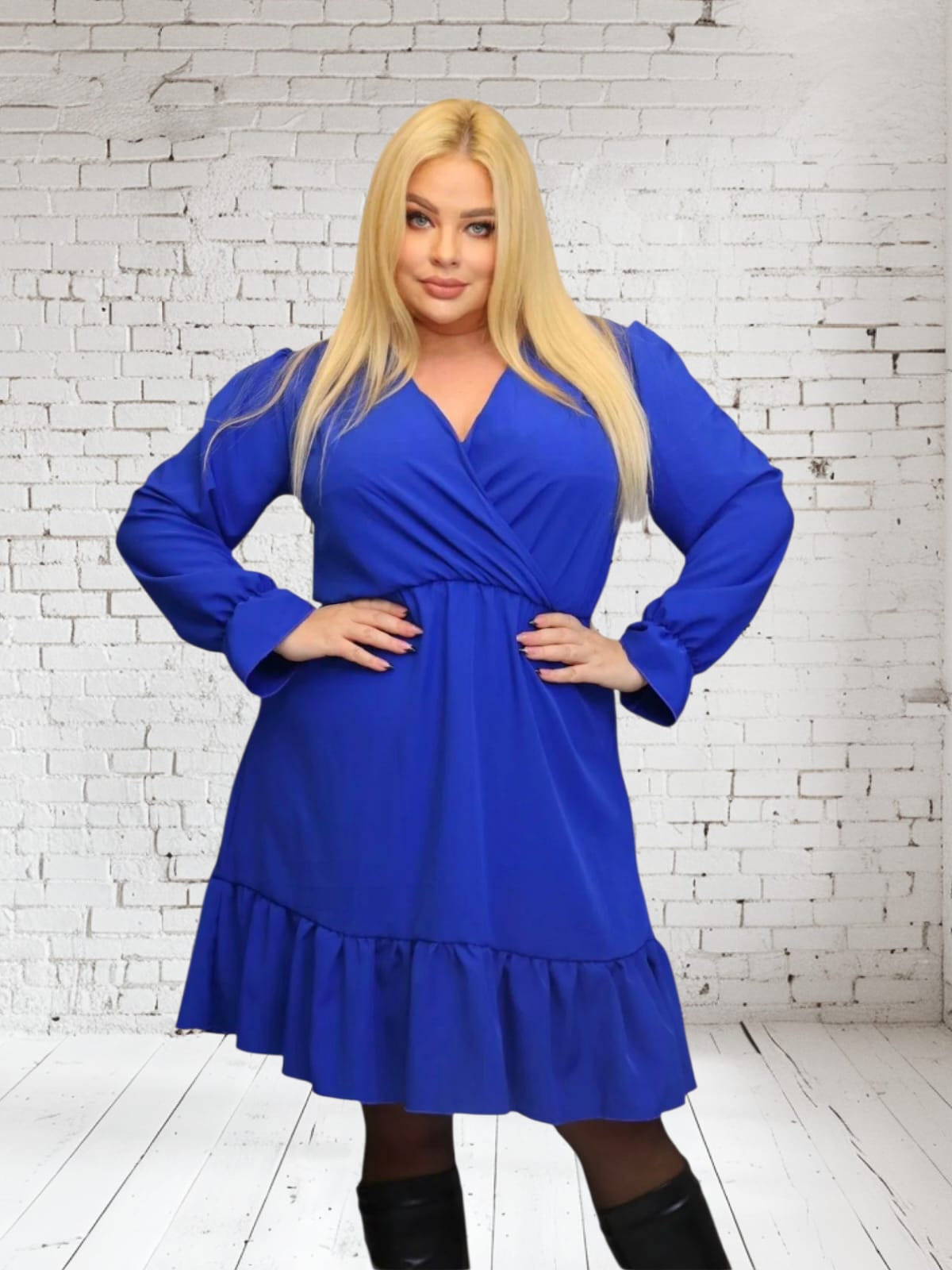 Sukienka Lundia rozkloszowana zwiewna tkanina silk kopertowy dekolt chabrowa