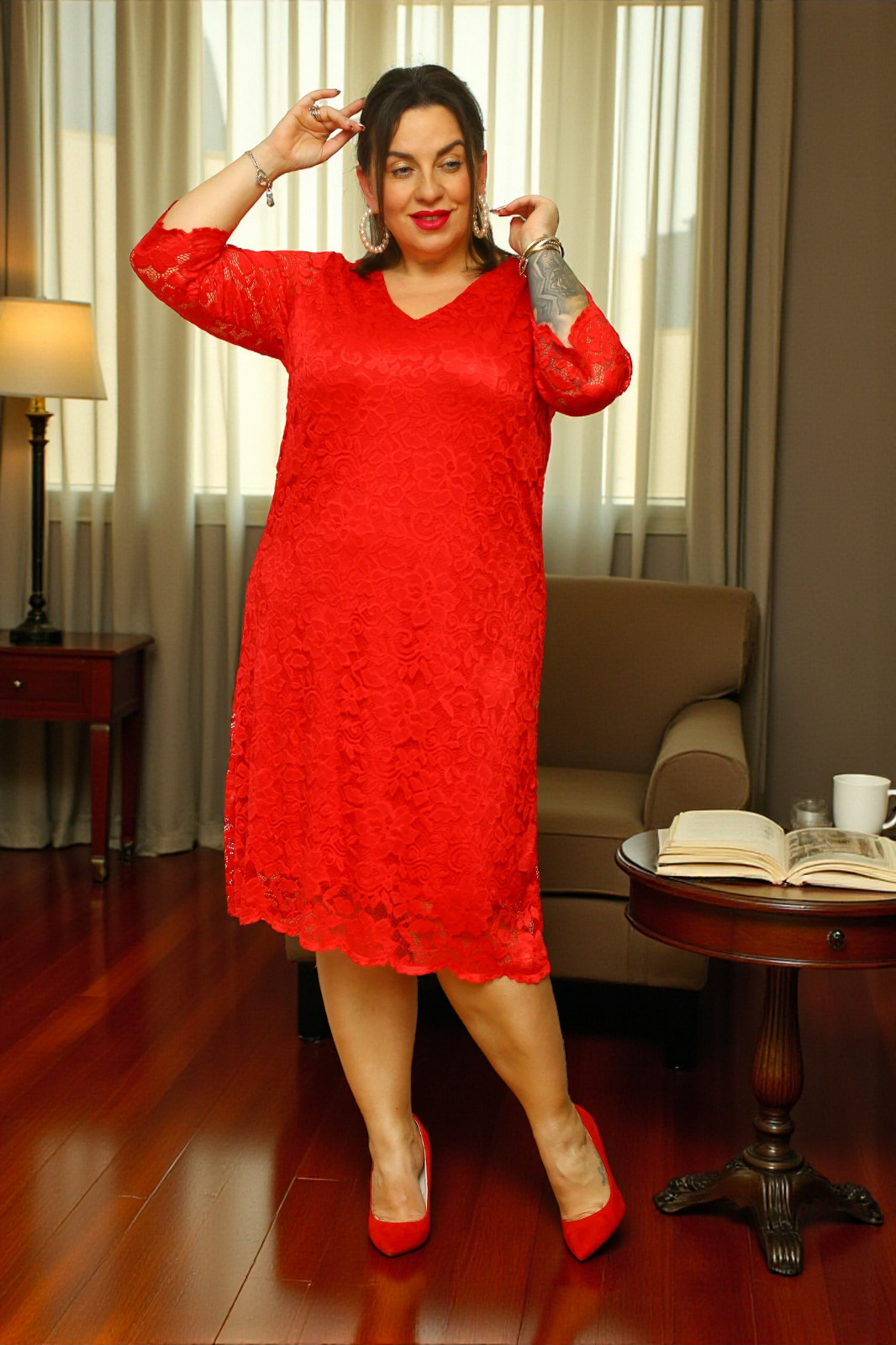 Sukienka jest wykonana z wysokiej jakości lekko elastycznej koronki oraz warstwy spodniej podszewki.