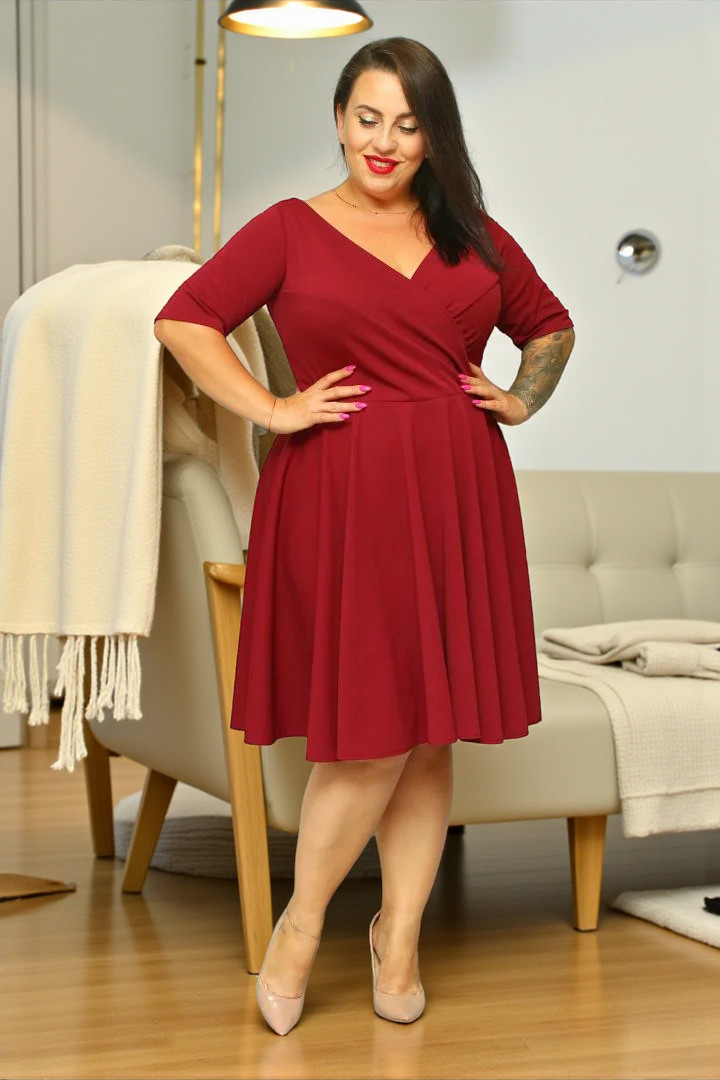 Sukienka jest wykonana z wysokiej jakości elastycznej dzianiny bawełnianej, który charakteryzuje się rozciągliwością około 4-6 cm.