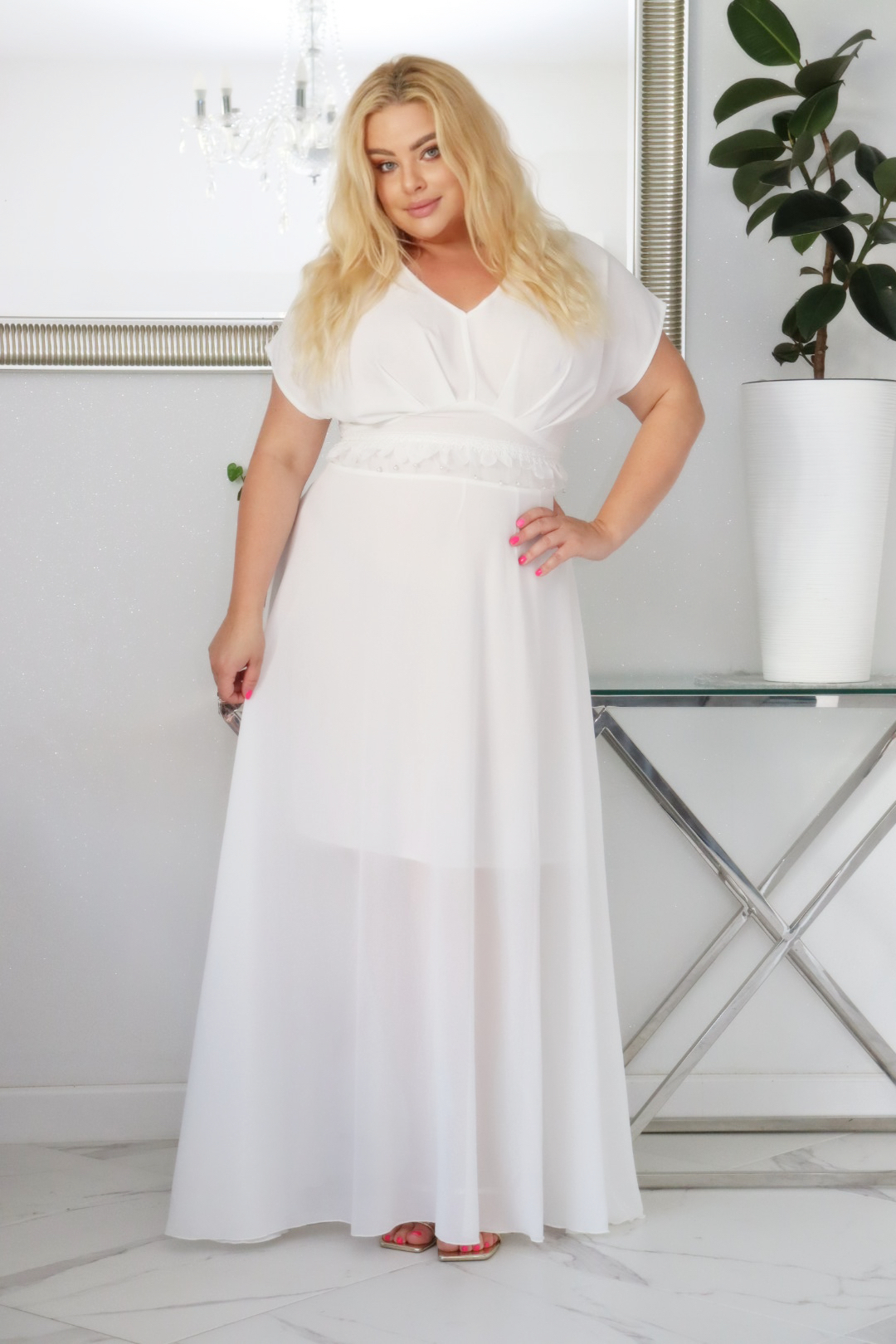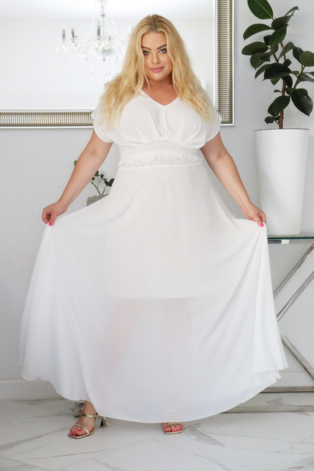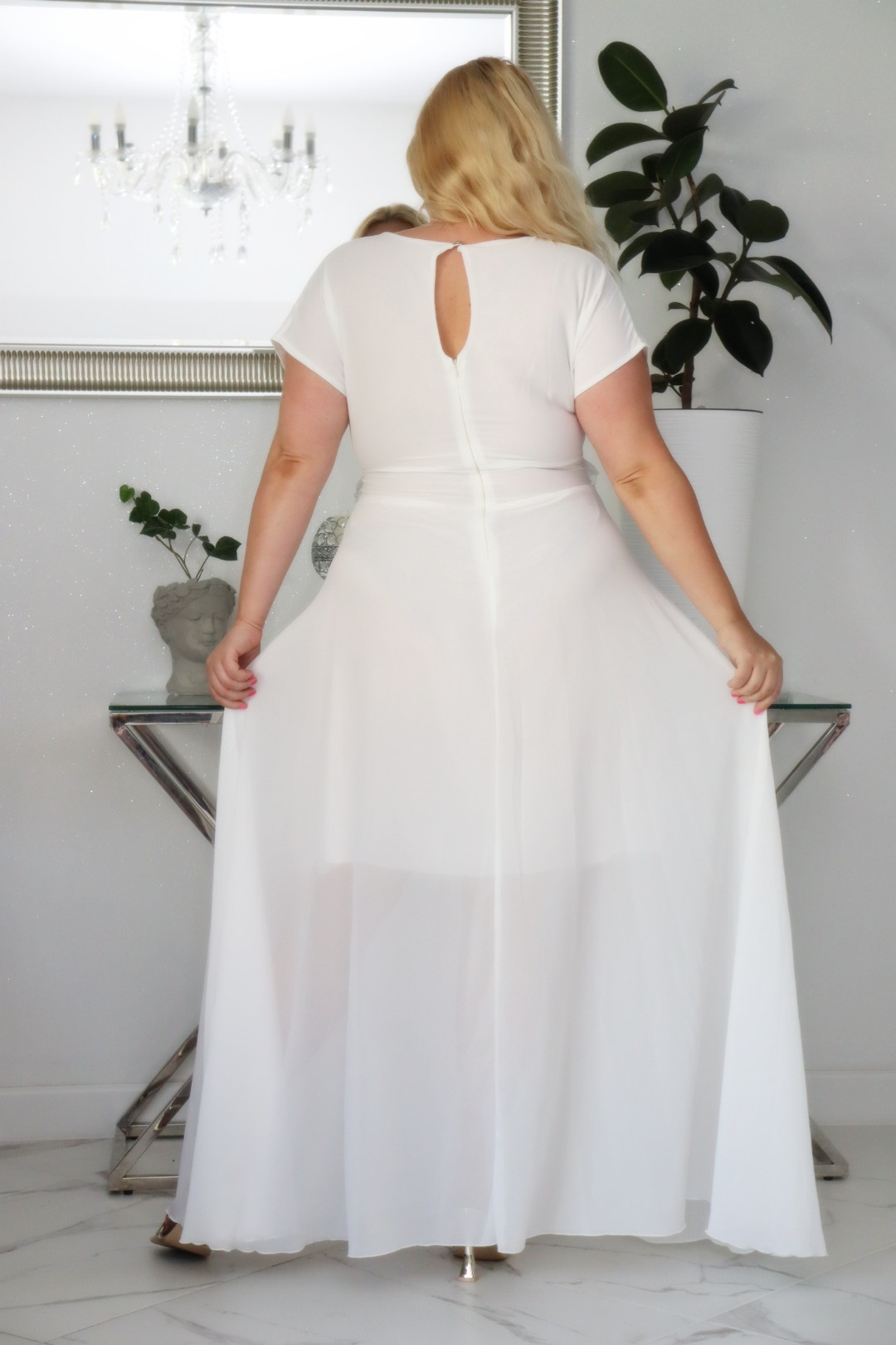 🇵🇱 Polski ProduktSukienka MELISA rozkloszowana long wieczorowa dekolt zakładki ECRU BIAŁA