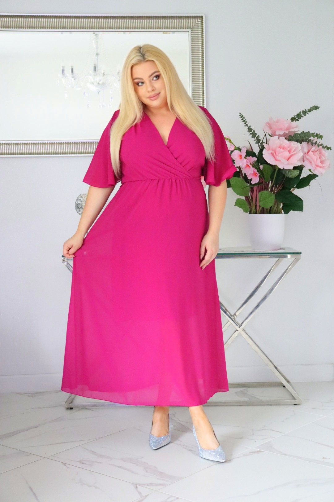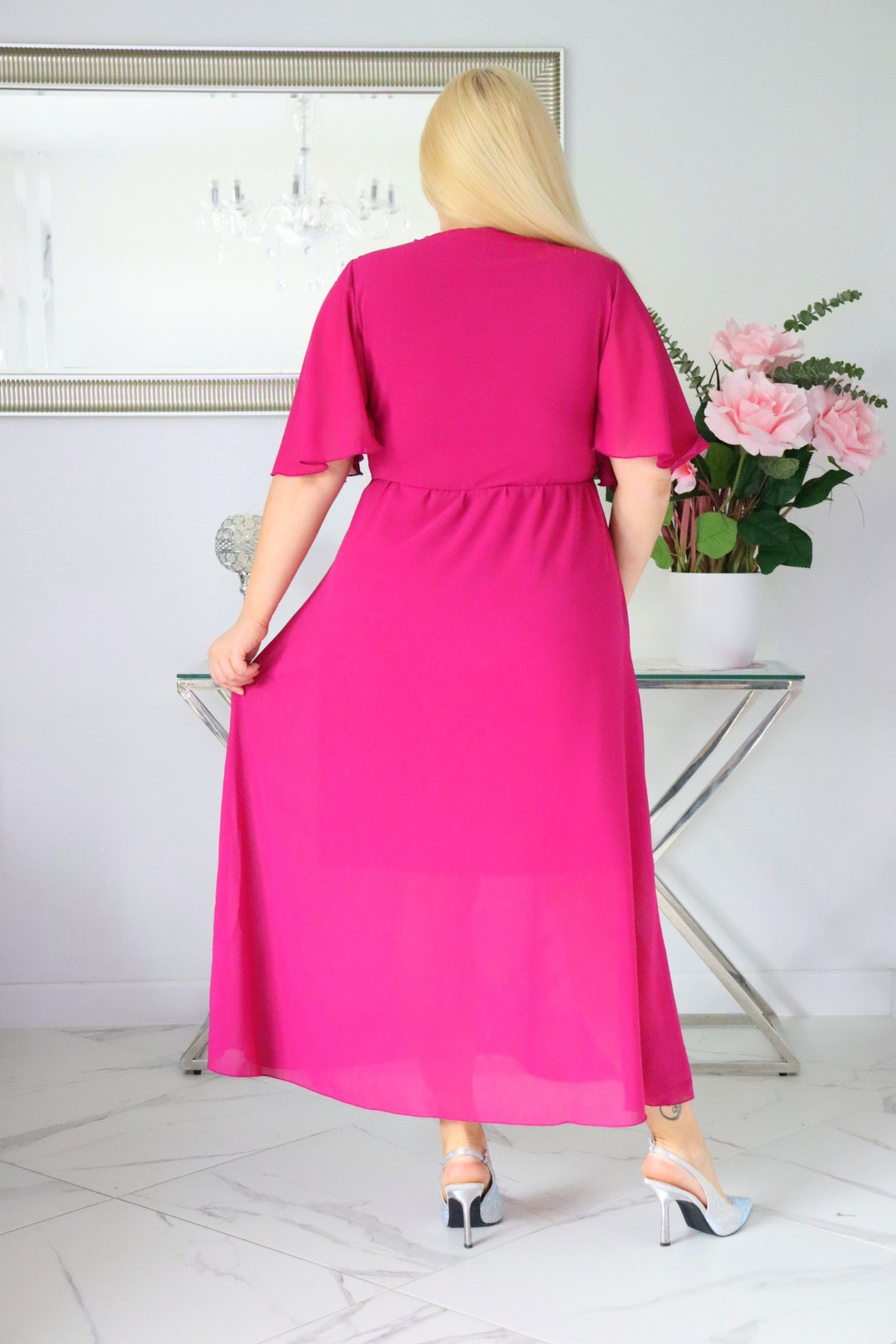 ⭐⭐⭐⭐⭐ 4.9Bestseller121+ sprzedanych!🇵🇱 Polski ProduktSukienka MAXI trapezowa Ariel z szyfonu żorżeta fuksja