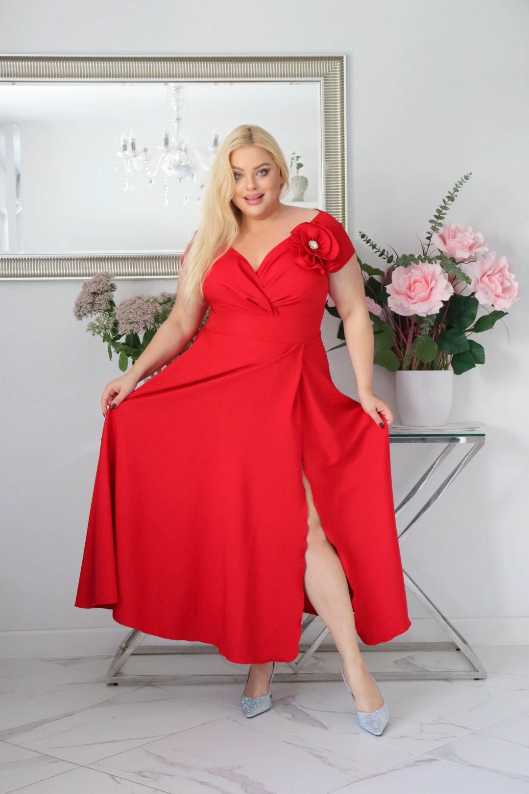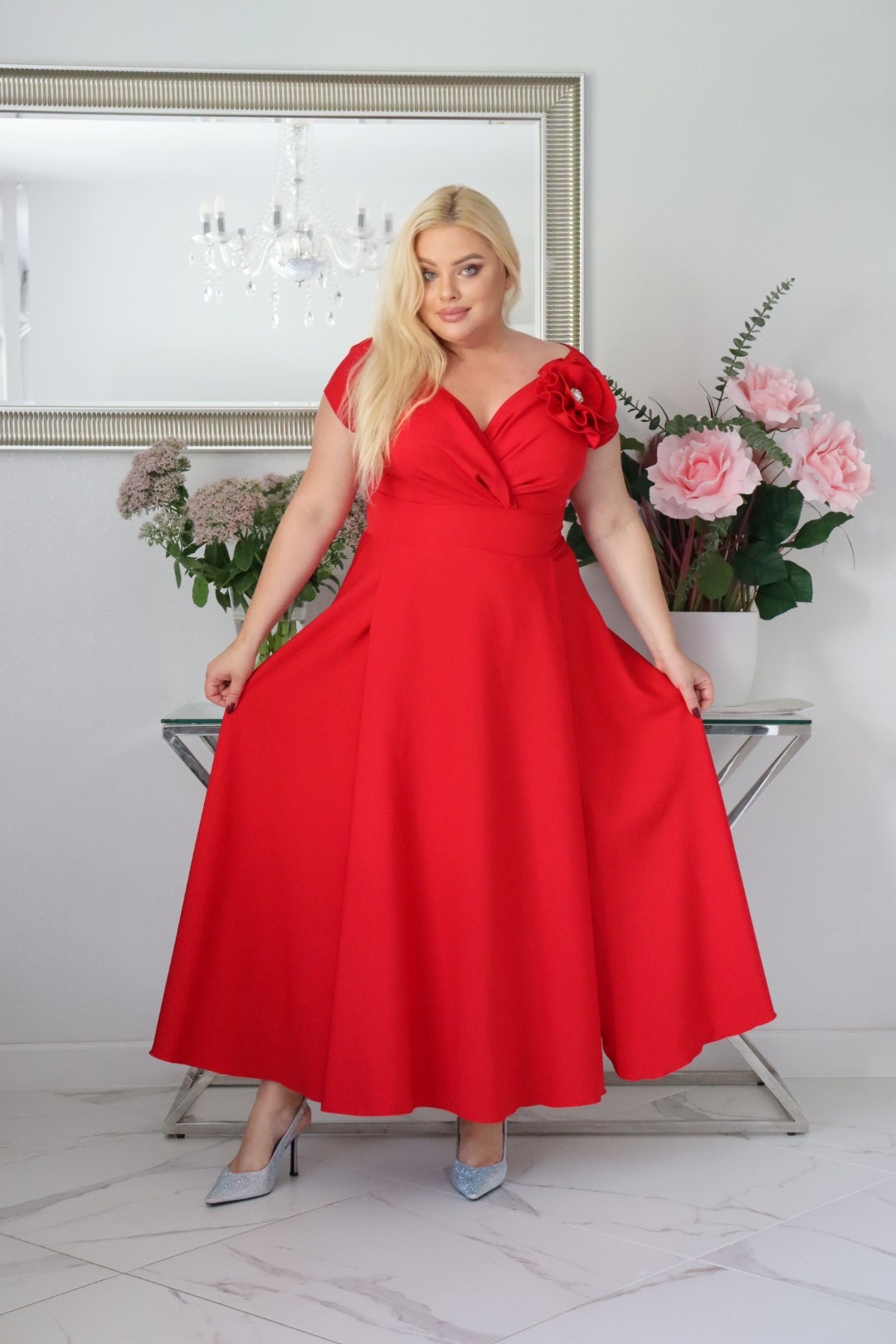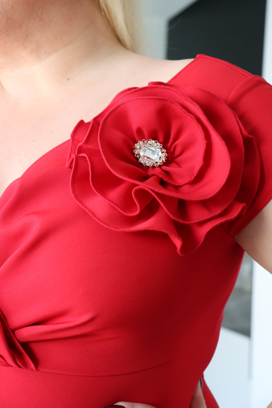 Olśniewająca sukienka Piwonia z wyjątkowym ręcznie szytym kwiatem i cyrkoniową ozdobą! Poczuj się wyjątkowo! Zobacz film jak się układa! CZERWONA