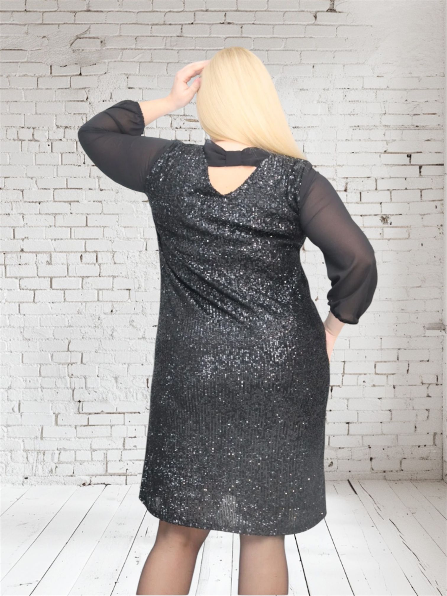 Sukienka jest wykonana z wysokiej jakości dzianiny cekinowej, która charakteryzuje się rozciągliwością około 4 cm.