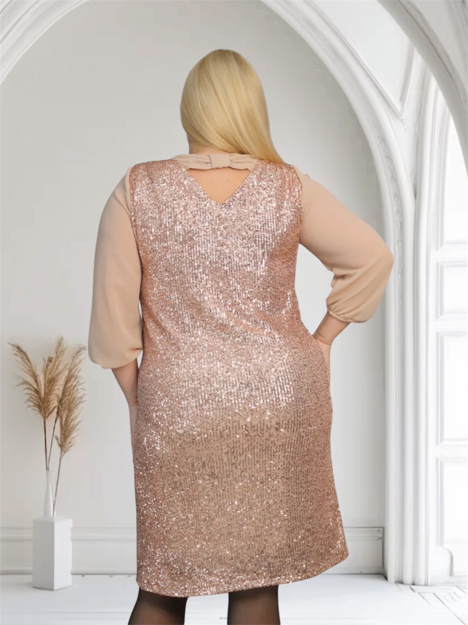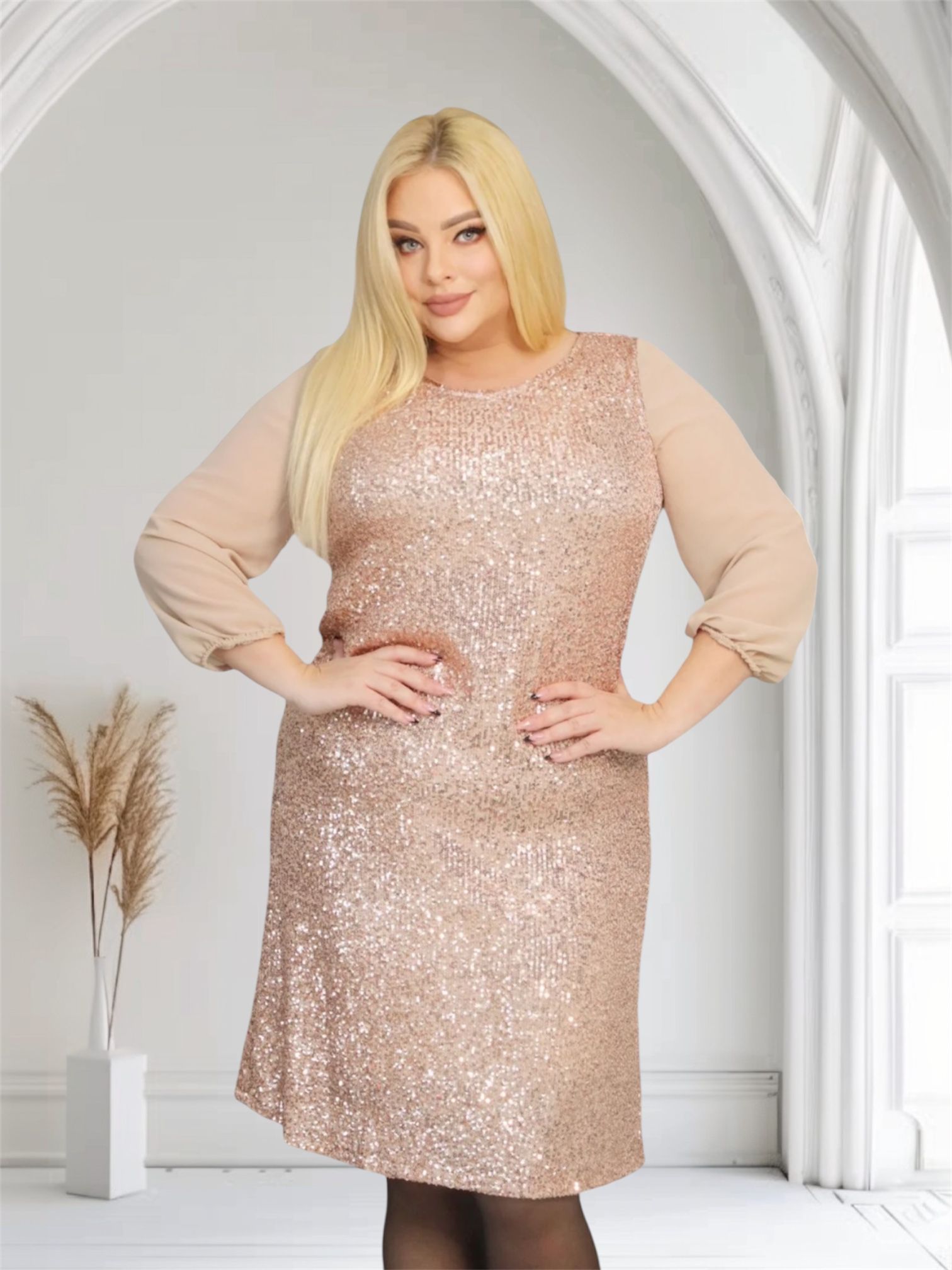 Sukienka jest wykonana z wysokiej jakości dzianiny cekinowej, która charakteryzuje się rozciągliwością około 4 cm.