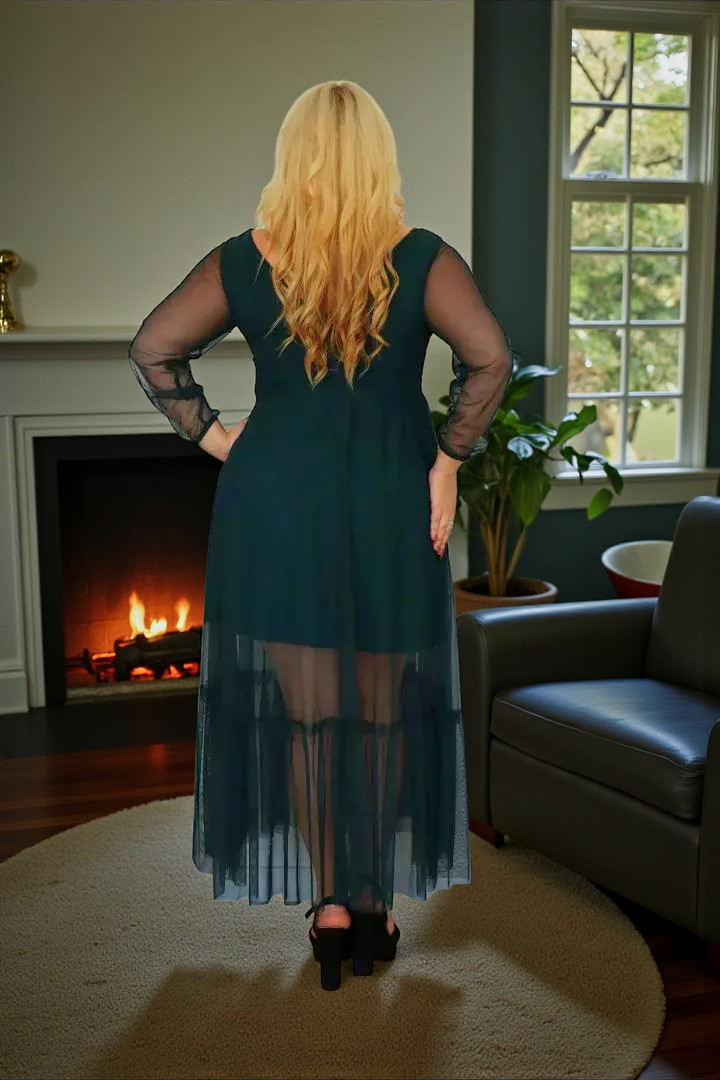 Sukienka idealnie zatuszuje wystający brzuszek. Dół sukienki jest rozkloszowany więc obwód bioder nie jest potrzebny.