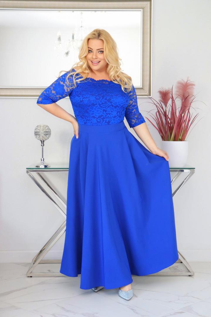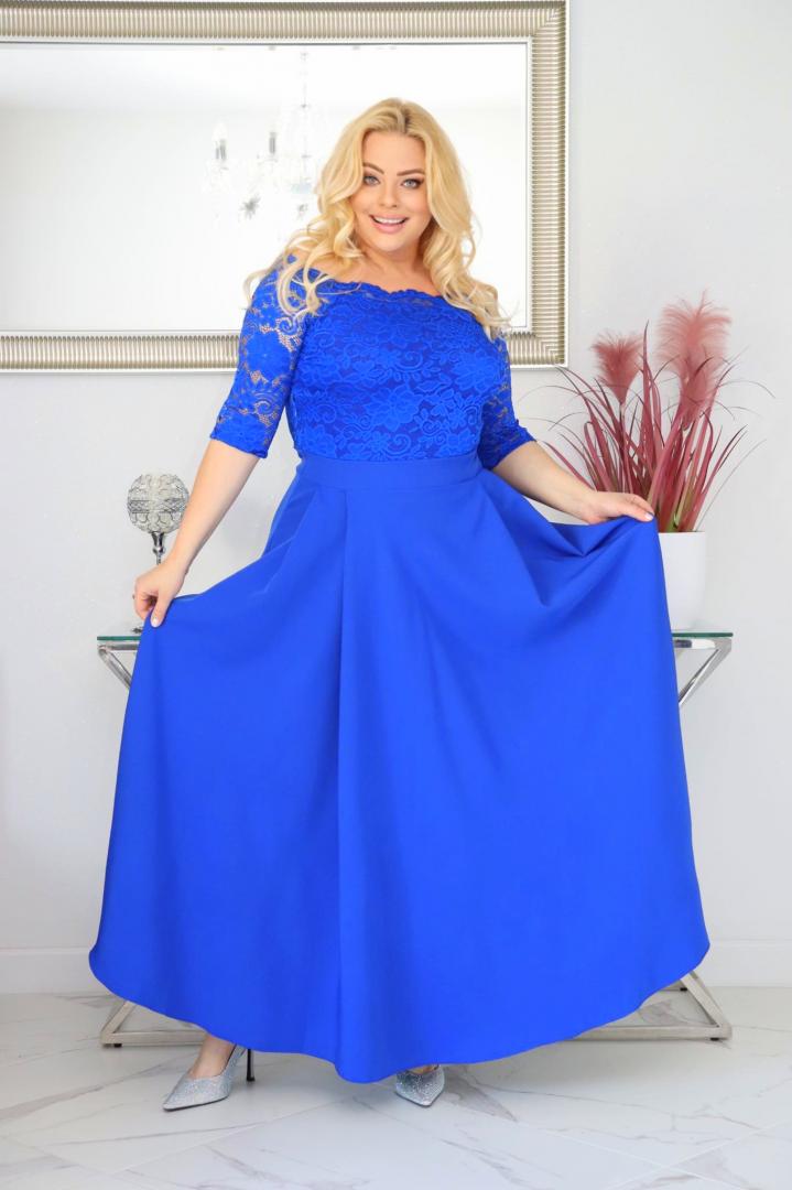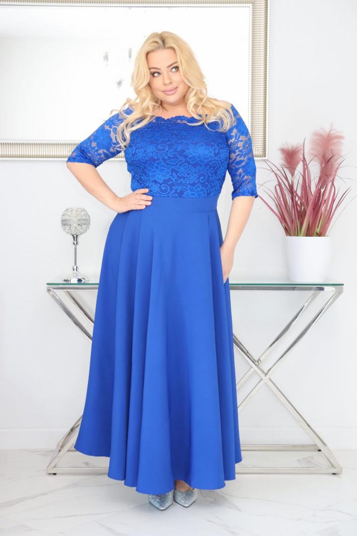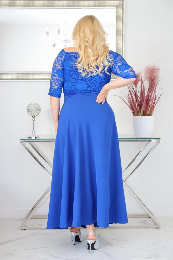 Sukienka Tamara maxi wieczorowa rozkloszowana ekskluzywna hiszpanka koronka gładka chabrowa