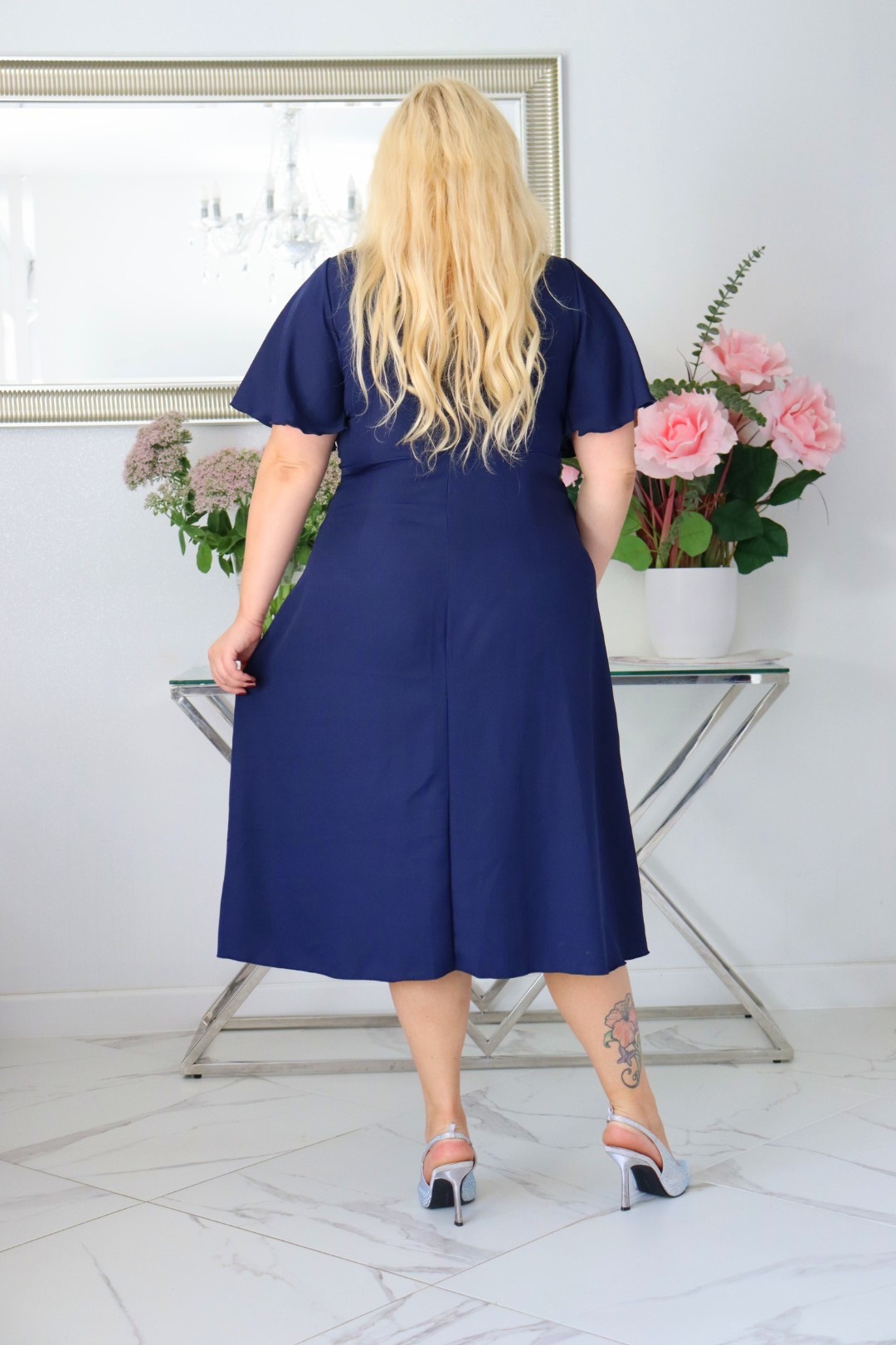 „Biżuteryjna klamra i motylkowe rękawy – detale, które tworzą idealną sukienkę midi Plus Size.”