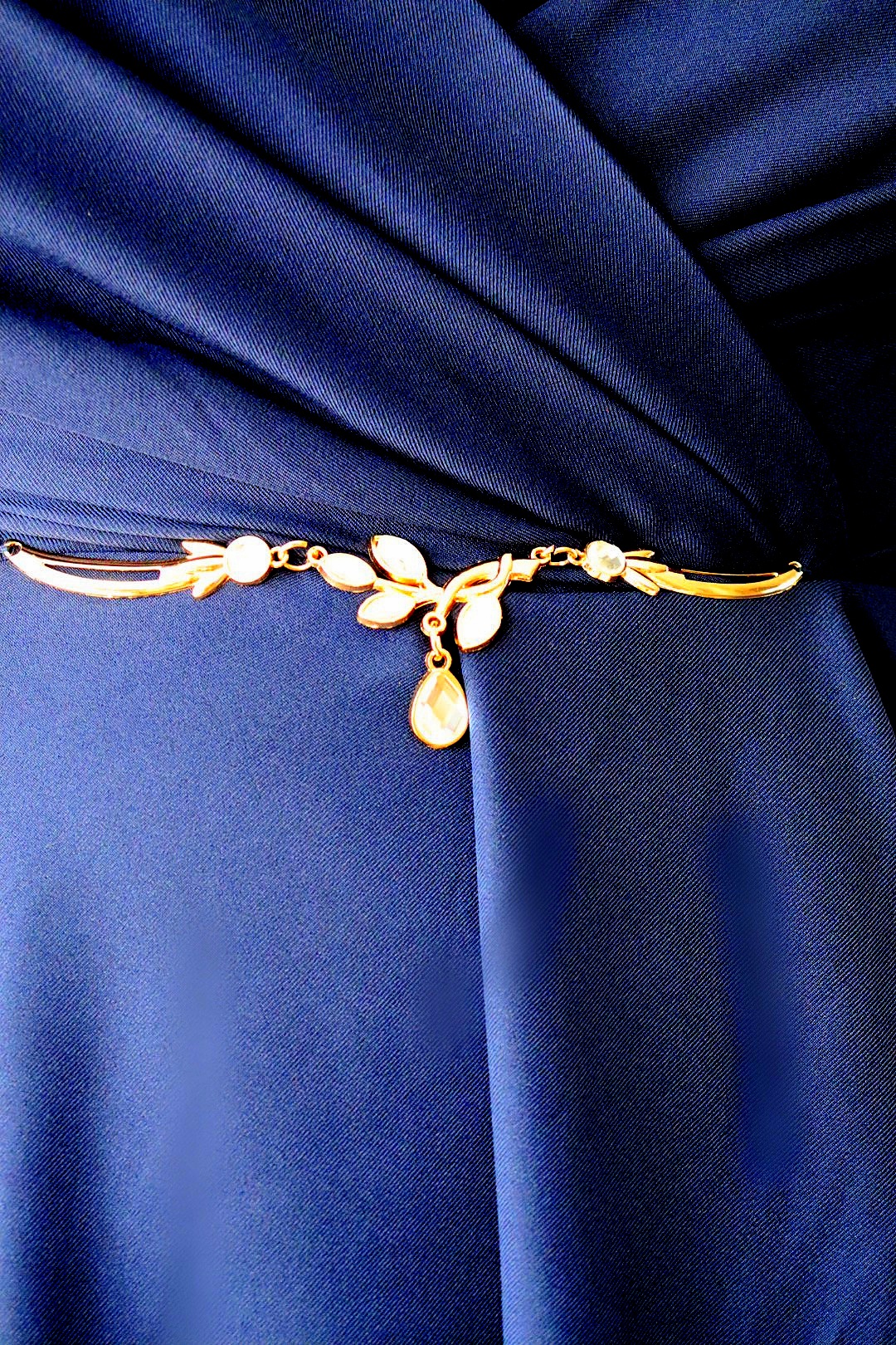 - Złota, biżuteryjna ozdoba umieszczona w talii skutecznie przyciąga wzrok do środka sylwetki, tworząc wyraźne wcięcie.