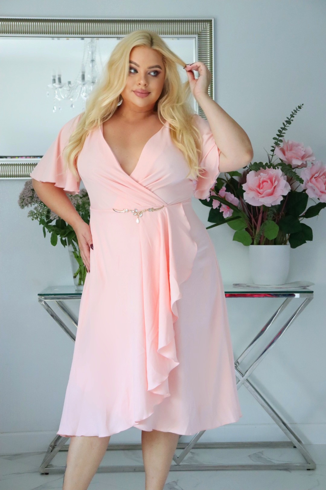 🇵🇱 Polski ProduktVelena PLUS SIZE: Sukienka z biżuteryjną klamrą – natychmiastowy Look Premium! Pudrowy róż!