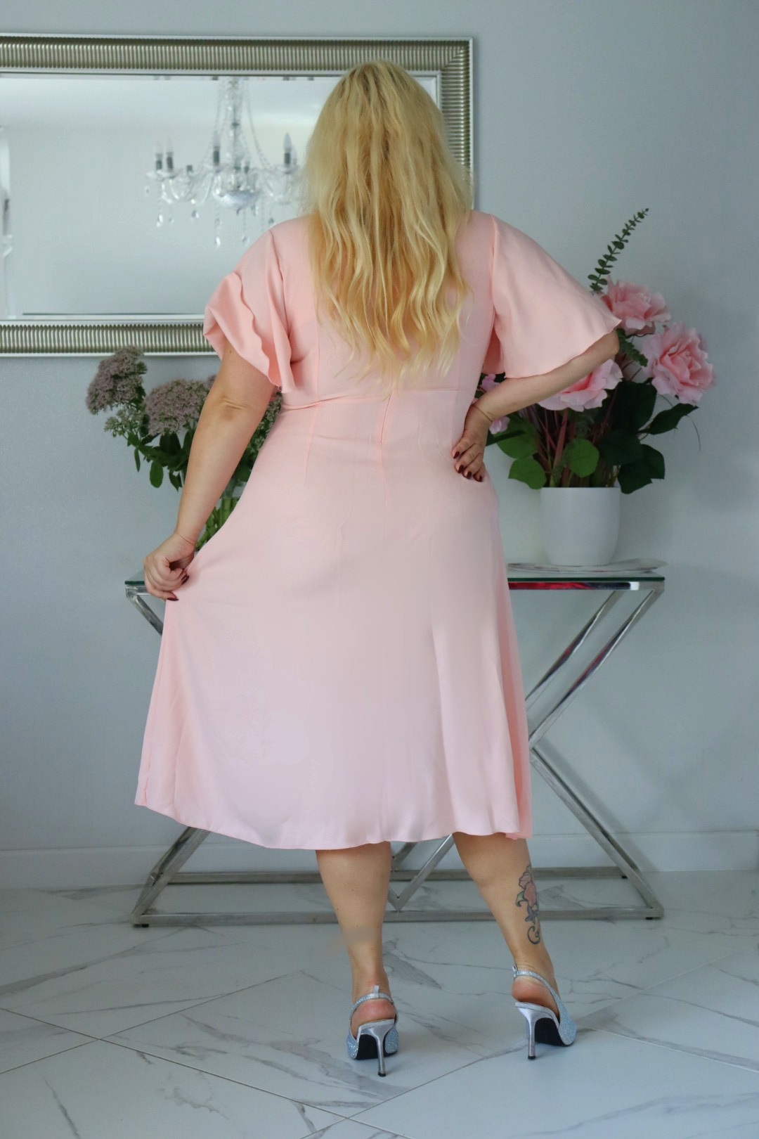 „Biżuteryjna klamra i motylkowe rękawy – detale, które tworzą idealną sukienkę midi Plus Size.”